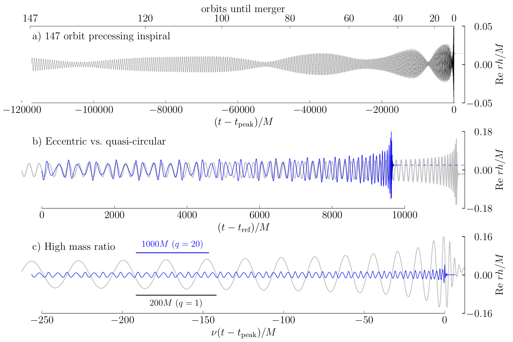 Building on this foundation, the Simulating eXtreme Spacetimes (SXS) Collaboration has generated some of the world’s most accurate waveform catalogues. Using the Spectral Einstein Code (SpEC), SXS simulations push the limits of computational calculations including high spins, precession, and eccentricity, as shown in Figure 2. NR results now inform every stage of gravitational wave modelling such as calibrating effective-one-body models, validating self-force and post-Minkowskian predictions, and training fast surrogates for data analysis.